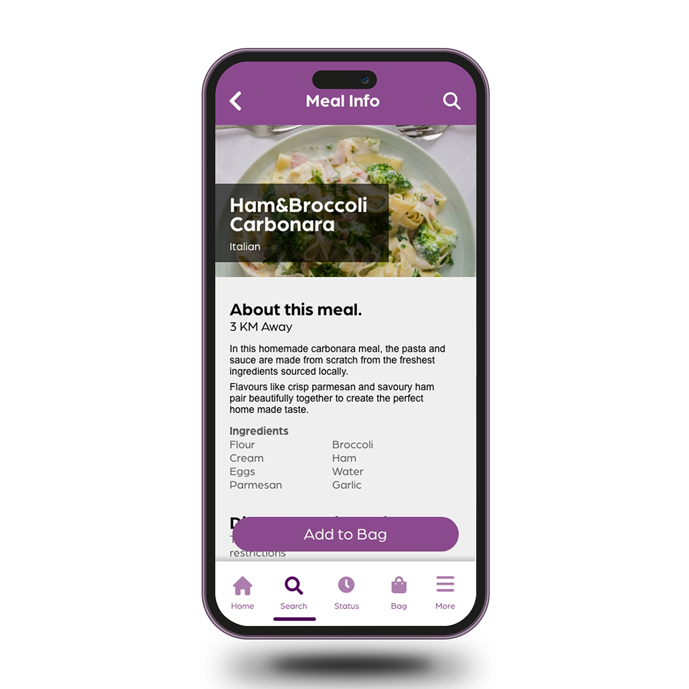 The product page was created to really put the meal on on display for the viewer. Since the app relies so heavily images, a feature image is prominently displayed at the top of the product page.