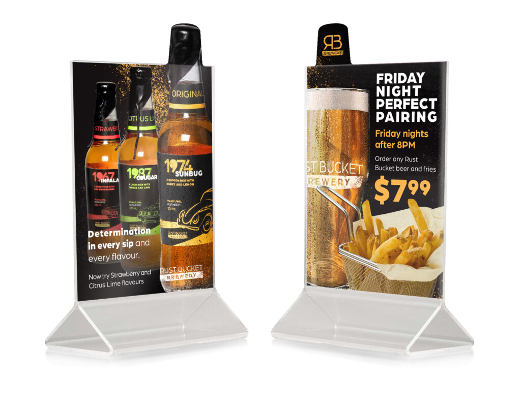These table talkers were designed with a custom die-line in Adobe Illustrator, Photoshop, and InDesign. The photography is original and and the pieces were edited together to create a table top advertisement that captures attention and shows off the products creatively.