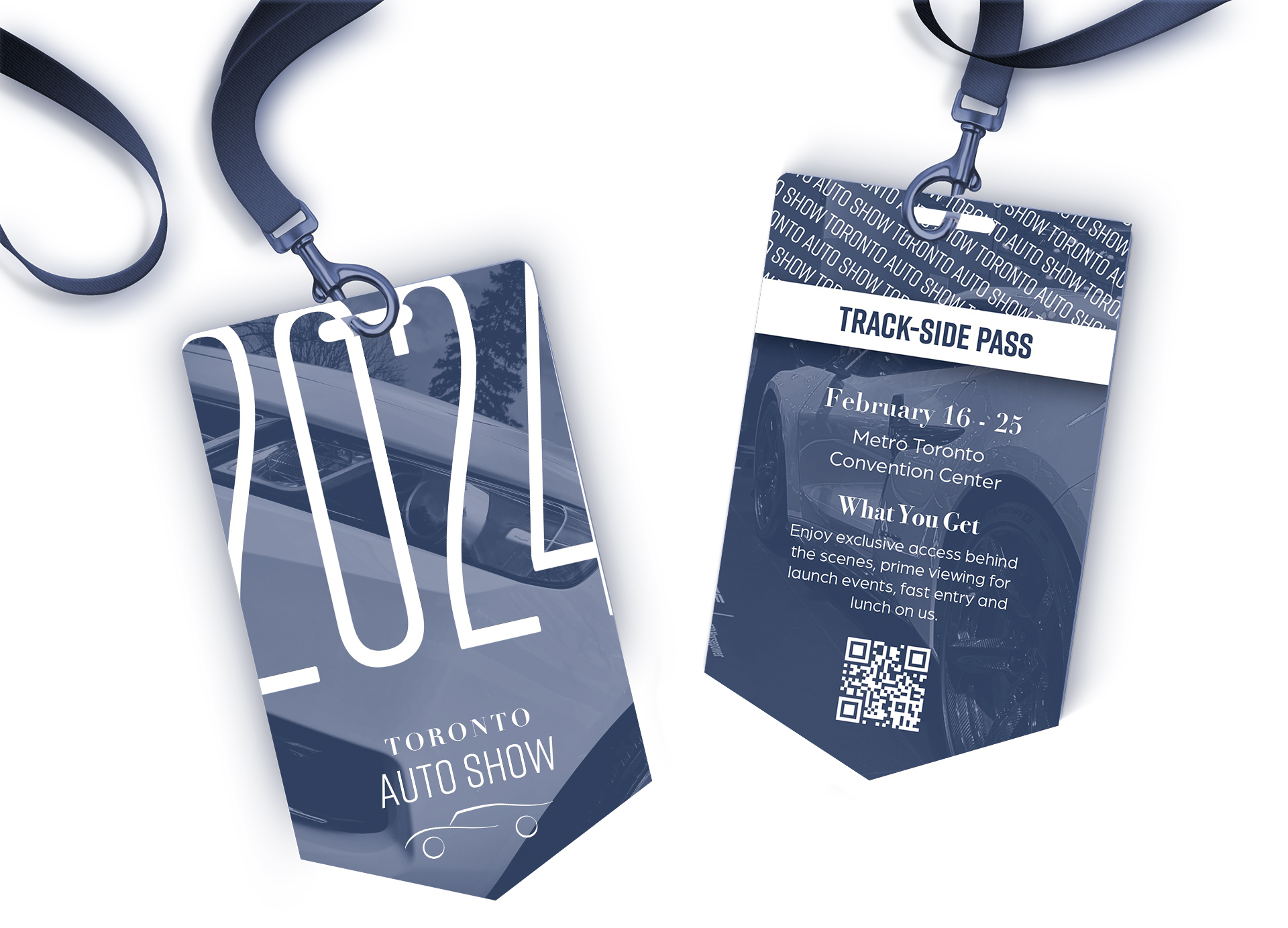 Starting with the sketches, I was able to come up with several strong ideas, but I wanted to do my own photography for the pass and I was planning on attending the 2024 Toronto Auto Show so my decision was made easy. The next thing I wanted to design for was a potential spot gloss finish over the “2024” text on the front panel and the “Auto show” graphic on the back panel. This acts as the required security feature as it would be difficult to reproduce.