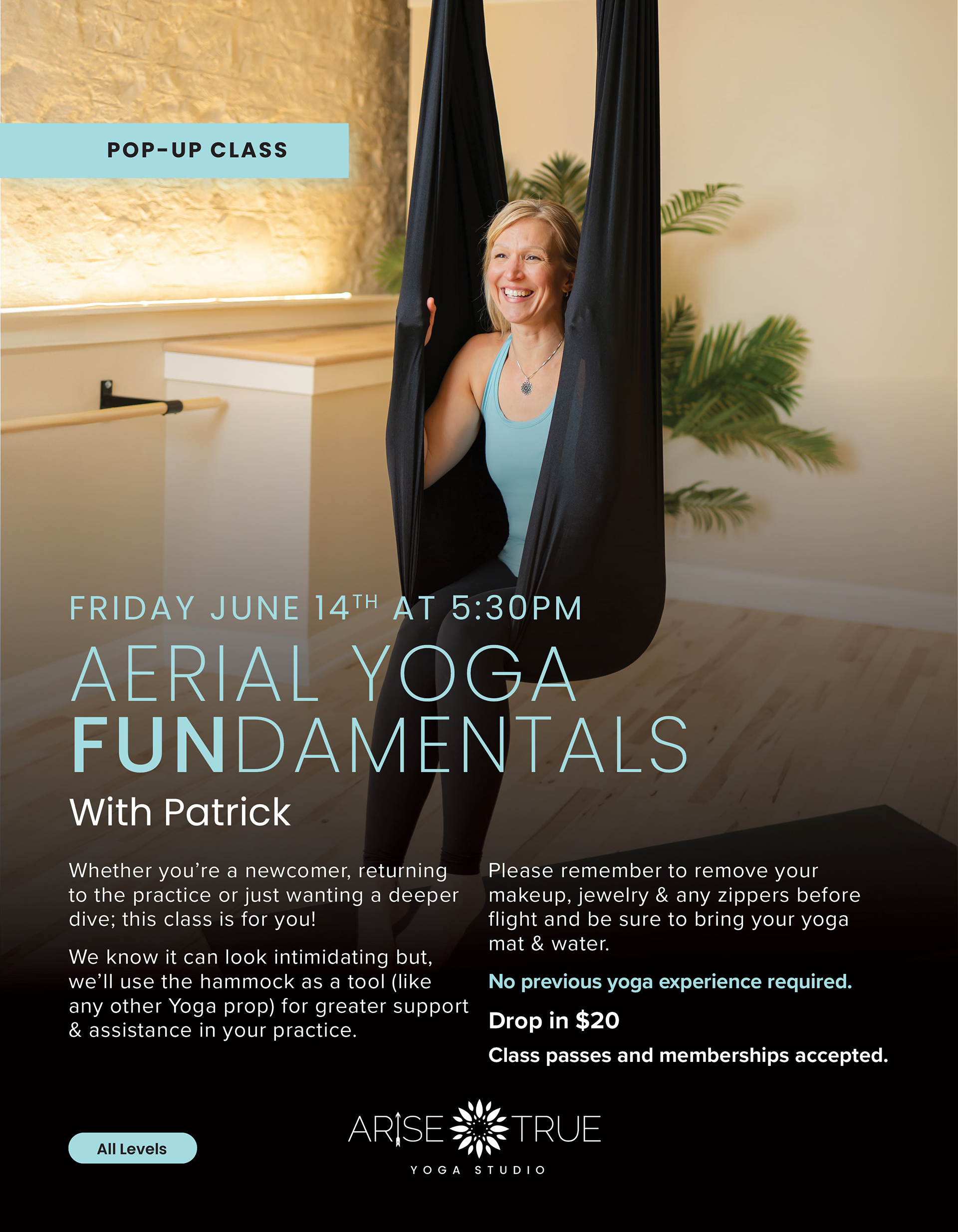 Today, they have expanded to a large studio offering dozens of scheduled classes for their members including aerial yoga. Additionally Arise True is proud to partner with the community to bring specialty and pop-up event style classes.