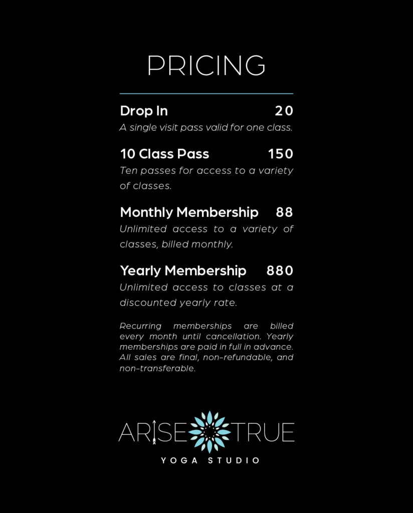 “At Arise True we believe that the practice brings us together in commUNITY. Delivering classes that will leave you feeling supported, stronger & more resilient to enjoy life to the fullest; Arise True the best version of you!”